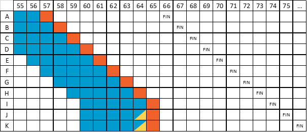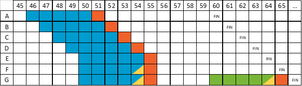 Si la fin de votre contrat est fixée avant 65 ans (les lignes A à E), votre plafond personnel est égal à la moyenne des cinq années maximum (les carrés bleus) qui précèdent les dix dernières années de votre contrat.