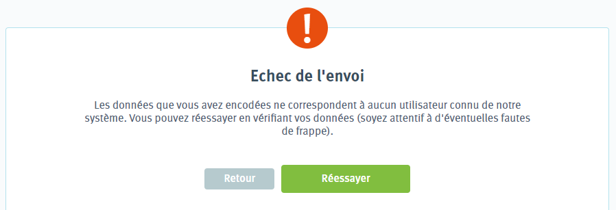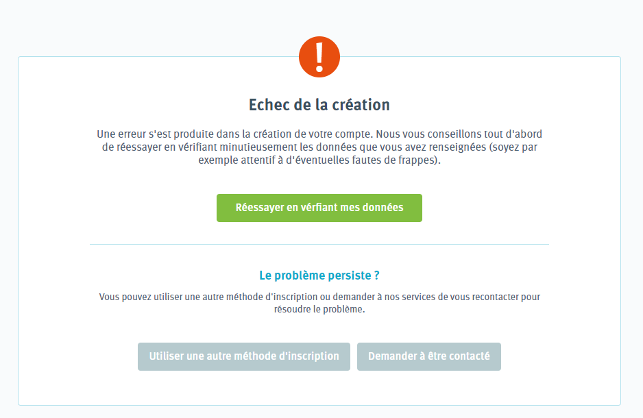 Ce message apparait quand vous choisissez de créer votre compte à l’aide de vos données personnelles et que celles-ci ne correspondent pas aux données enregistrées dans notre système.