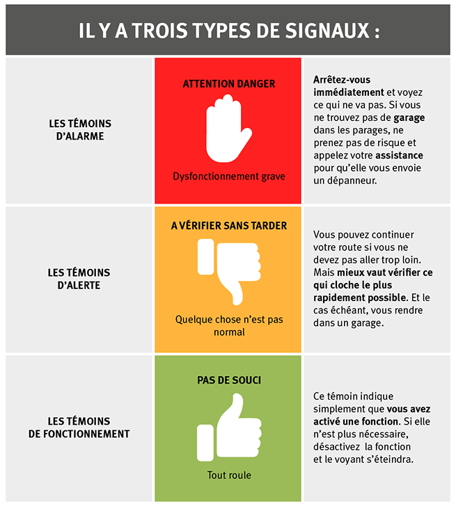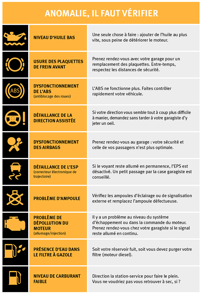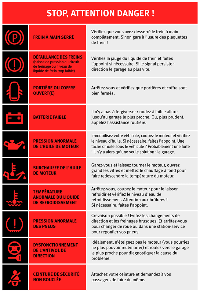 Glissez-le dans la pochette de bord, avec vos documents de voiture obligatoires (carte verte, certificat d’immatriculation, certificat du contrôle technique). Ainsi, si un témoin s’allume, un petit coup d’œil au mémo et vous saurez à quoi vous en tenir.