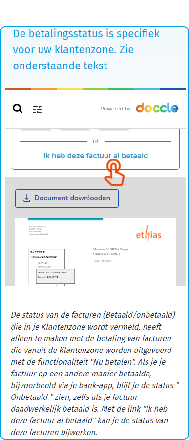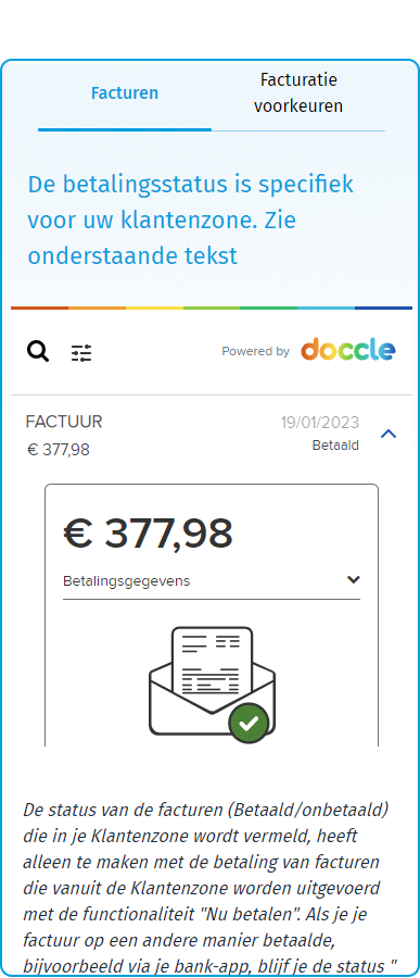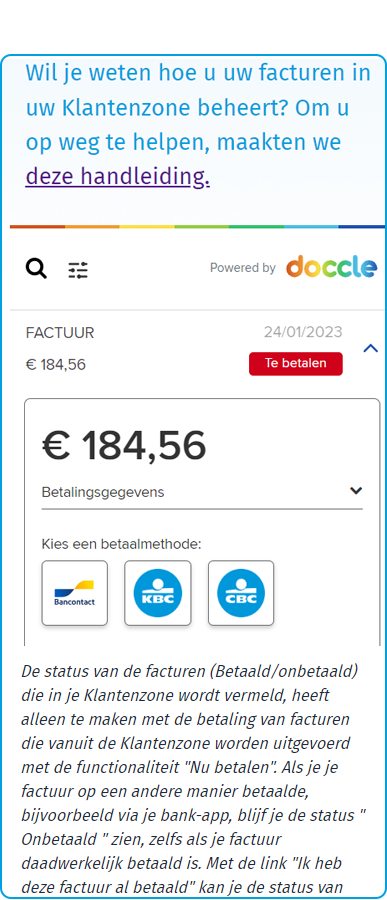 Heb je je factuur betaald via een andere weg dan via de Klantenzone (overschrijving of de betaalknop in de email), pas onderaan zelf de betaalstatus aan via de link ‘Ik heb deze factuur al betaald’.