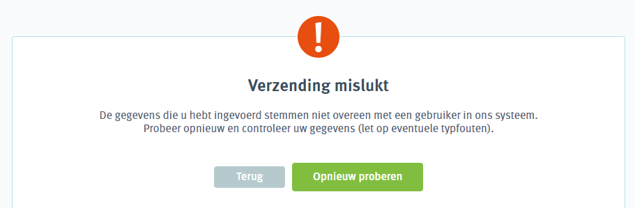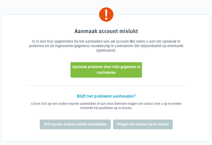 Deze melding verschijnt wanneer u heeft gekozen om uw account aan te maken via uw persoonsgegevens en de gegevens niet overeenkomen met de gegevens in ons systeem.