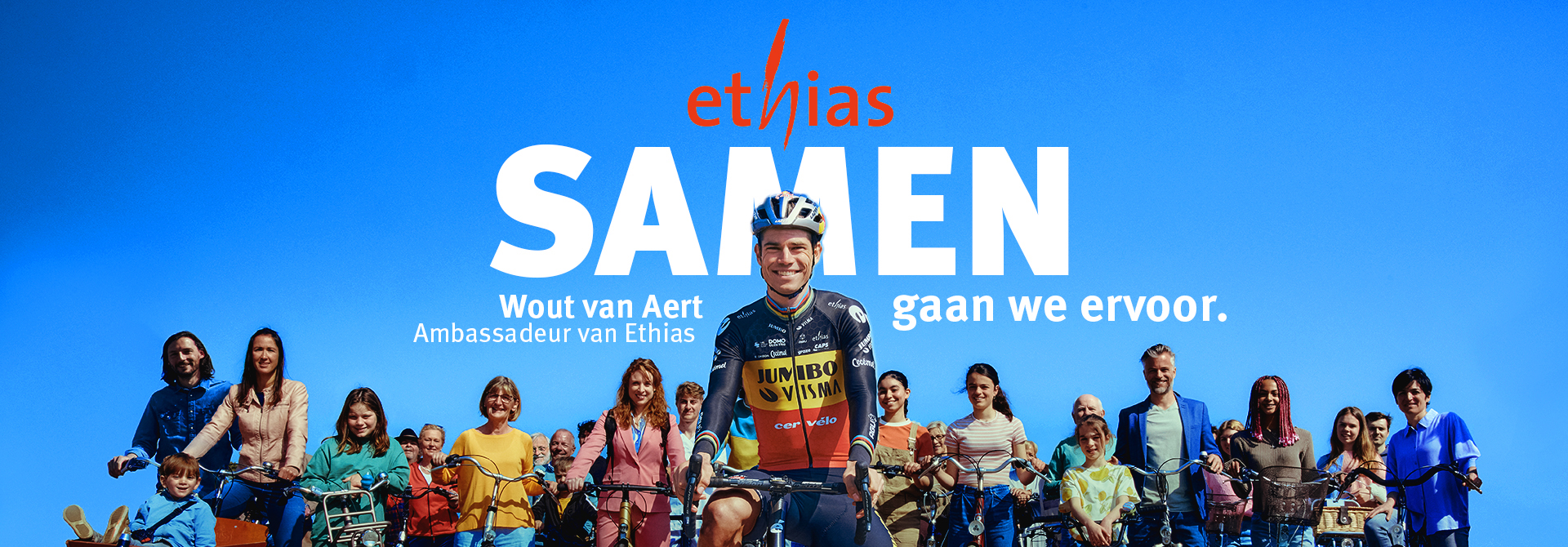Wout van Aert, onze nationale trots en wereldtopper in het wielrennen, is sinds dit jaar Ethias ambassadeur. In ons beider DNA, staan menselijkheid, solidariteit én ambitie centraal. Sterke waarden die de basis vormen van een gloednieuwe Ethias campagne met Wout én alle Belgen in de hoofdrol.