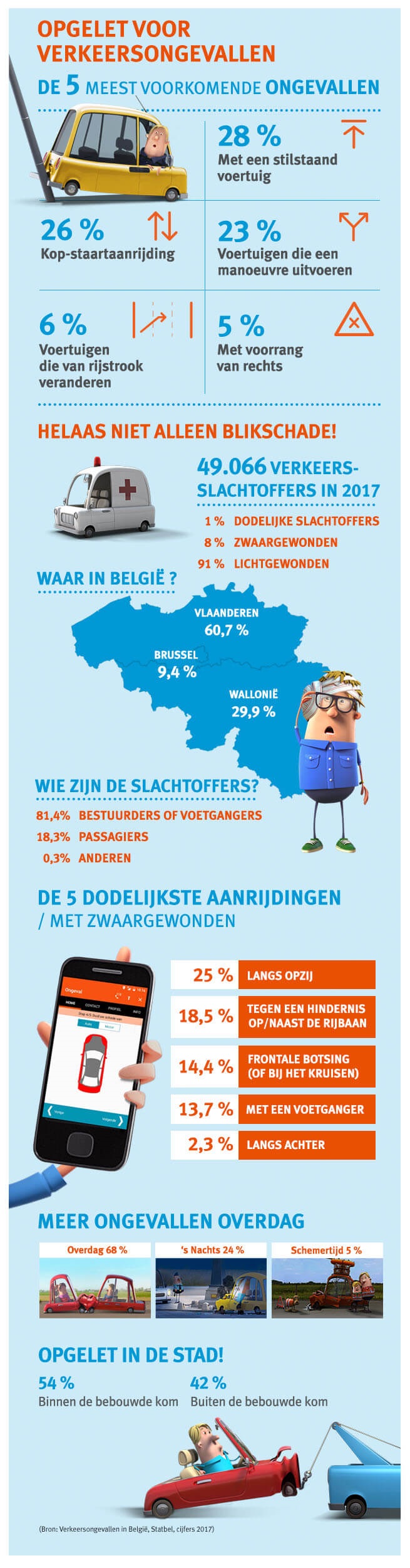 In 2017 registreerde de Belgische politie bijna 50.000 verkeersongevallen met lichamelijk letsel. Het aantal doden is dan wel met 8% gedaald tegenover 2016, toch zijn 615 mensen op onze Belgische wegen omgekomen. 72% van deze slachtoffers waren de bestuurders zelf. En niet echt verrassend: de categorie 20-39 jaar telt de meeste (35%) dodelijke ongevallen. Maar welk type aanrijding gebeurt nu het vaakst? Ethias duikt in de cijfers van het Belgische statistiekbureau.