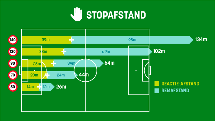 Of vele andere onschuldige levens. Want hoe sneller u rijdt, hoe langer het duurt voor u stilstaat. Met 50 km/u is uw stopafstand al 26 meter. Tel daar nog 8 meter bij - de lengte van 2 wagens - met 60 km/u. En met 120 km/u hebt u 102 meter nodig voor u stilstaat. Da’s langer dan een voetbalveld! Kijk maar: