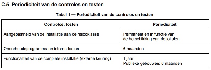 De periodiciteit en de aard van controles en onderhoud worden bepaald door middel van een risicoanalyse die rekening houdt met de wetgeving, normen, goede praktijken en voorschriften van de fabrikant of installateur.